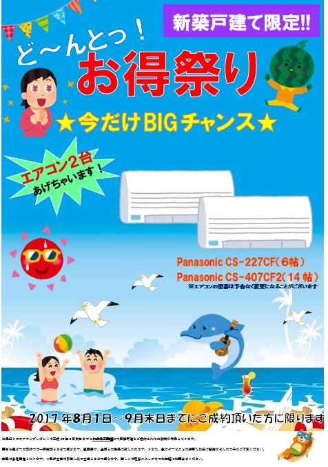 弊社でご成約頂いた方には、エアコン2台プレゼントだけで